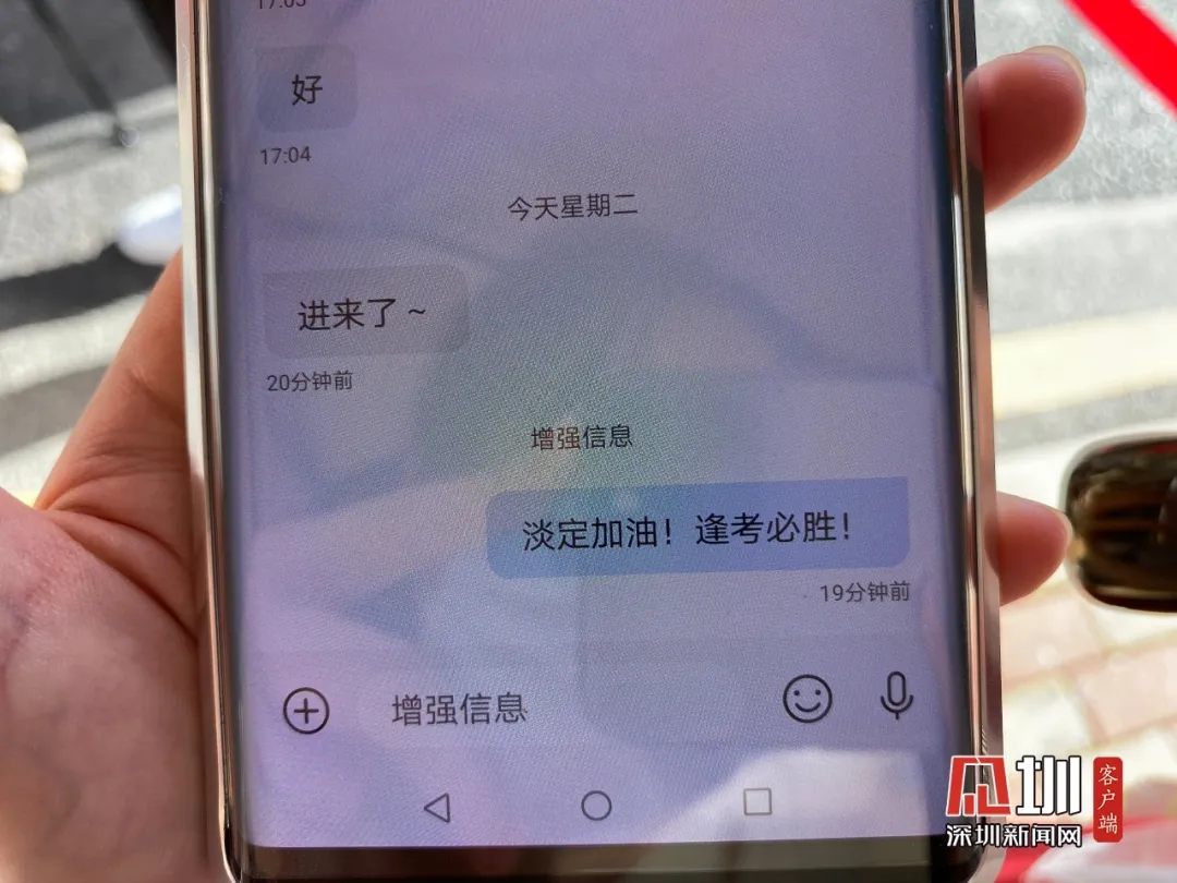 今早,在深圳中學(xué)送考現(xiàn)場(chǎng),陳女士向記者展示給孩子發(fā)的高考加油短信:淡定,加油,逢考必勝。