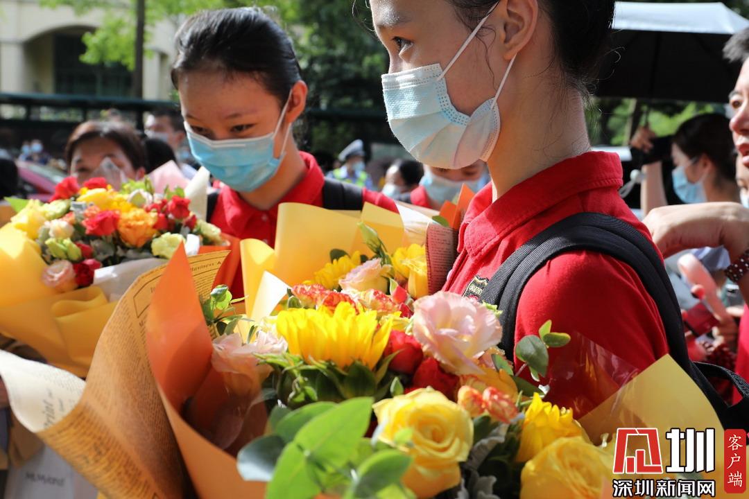 深圳高級中學(xué)考點(diǎn)外舞蹈隊(duì)學(xué)妹手捧鮮花,靜候?qū)W姐走出考場。