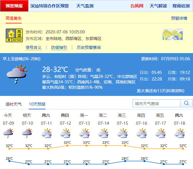 見圳客戶端?深圳新聞網(wǎng)2020年7月9日訊 根據(jù)深圳氣象局消息,深圳今日多云,有短時(shí)(雷)陣雨;氣溫28-32℃,中北部地區(qū)最高氣溫34-35℃;西南風(fēng)3-4級,沿海、高地和海區(qū)最大陣風(fēng)6級;相對濕度65%-90%。