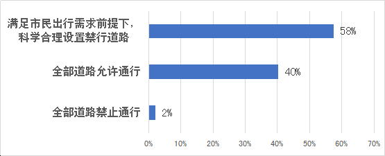 據(jù)調(diào)查,約58%的市民支持在滿足市民出行需求前提下,科學(xué)合理設(shè)置禁行道路;40%的市民認(rèn)為應(yīng)該全部道路允許電動二輪車通行;僅2%的市民認(rèn)為電動二輪車應(yīng)當(dāng)在全部道路禁止通行。