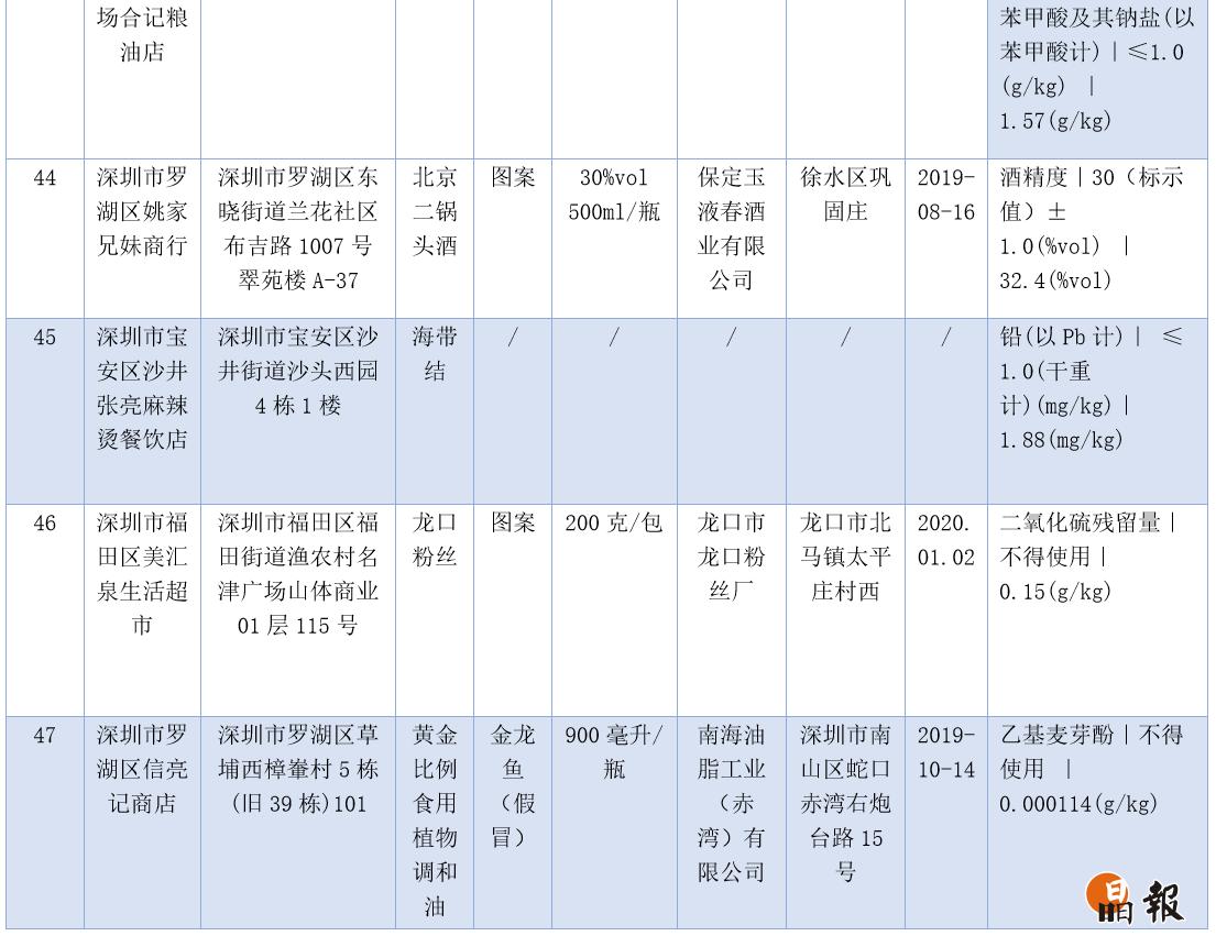 見圳客戶端·深圳新聞網(wǎng)2020年7月17日訊(晶報(bào)記者 鄧裴裴/制圖)7月17日,深圳市市場監(jiān)督管理局官網(wǎng)發(fā)布了2020年第二十二期食品安全抽樣檢驗(yàn)情況通報(bào),3-5月,共抽檢生產(chǎn)、流通、餐飲環(huán)節(jié)食品1229批次,發(fā)現(xiàn)不合格樣品47批次。記者注意到,不少不合格樣品抽檢單位為餐飲店,包括皇軒酒店、窯雞王、愛上牛蛙、御可奶茶等,還有些小吃店、腸粉店、螺獅粉店紛紛上榜。涉及不合格項(xiàng)目類別包括農(nóng)藥殘留、獸藥殘留、食品添加劑、微生物污染、品質(zhì)指標(biāo)、金屬等元素污染物。