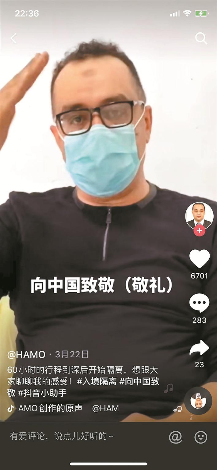 而在另一邊,方哈默也自愿當(dāng)起了中國(guó)防疫宣傳大使,他用短視頻在抖音記錄了中國(guó)抗疫暖心舉措,向國(guó)內(nèi)外宣傳羅湖各項(xiàng)防疫措施,截至目前,他在抖音已收獲了2.4萬的點(diǎn)贊量。網(wǎng)友們紛紛留下了暖心的鼓勵(lì)“謝謝你的理解”“歡迎你來到中國(guó)”?!拔蚁壬莻€(gè)比較開朗的人,也很喜歡中國(guó)的生活環(huán)境,喜歡中國(guó)人,我們周圍的鄰居、朋友對(duì)我們很好,沒有因?yàn)楝F(xiàn)在的疫情就歧視外國(guó)人或不敢靠近。所以他的心態(tài)一直都不錯(cuò)?!狈焦奶嬖V記者,其實(shí),對(duì)于她的丈夫來說,中國(guó)已經(jīng)是他的第二個(gè)家鄉(xiāng)。在疫情發(fā)生以來,他一直孜孜不倦地向所有朋友分享著中國(guó)政府在此次疫情中所做的努力和貢獻(xiàn)。