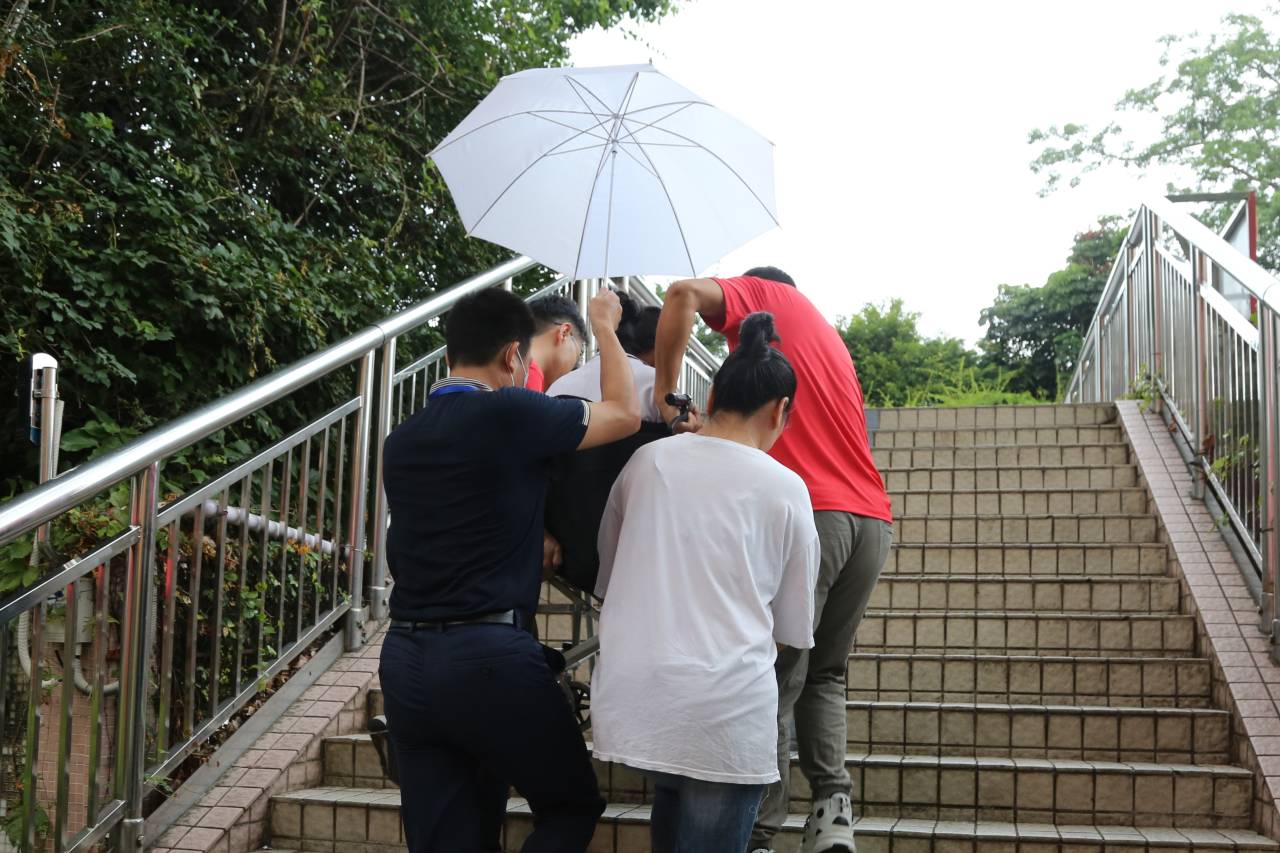 東升學??键c有一位行動不便的考生,學校派三名工作人員提前護送考生到考場。 (記者李麗、周紅聲)