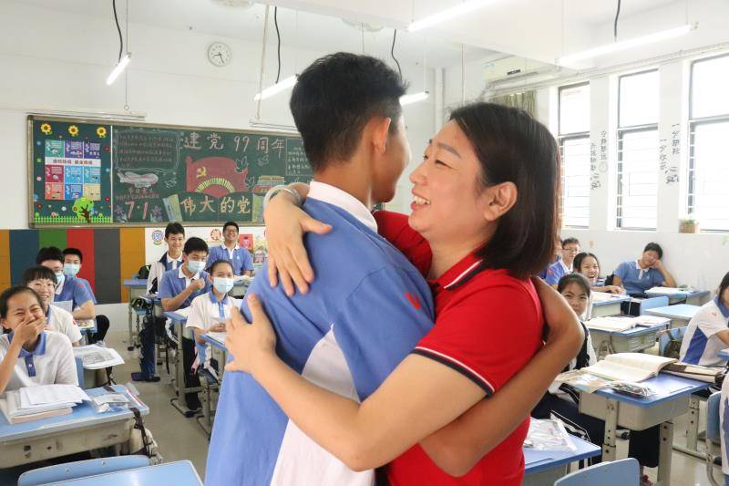 坪山同心外國語學校授課老師加油打氣:和語文老師擁抱,考試滿分! (焦子宇 耿超逸文/圖)