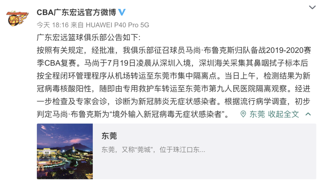 7月19日,廣東新增境外輸入無癥狀感染者1例,為東莞報告,來自美國,在入境口岸發(fā)現(xiàn)。經(jīng)確認,此人是CBA廣東宏遠男籃外援馬尚·布魯克斯。