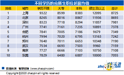 上海、北京、深圳、廣州這些一線城市的應(yīng)屆生平均起薪相對(duì)較高。一般而言,在各城市中,隨著學(xué)歷的提高,應(yīng)屆生起薪也會(huì)相應(yīng)增加。但由于職業(yè)或行業(yè)的人才缺口較大,使得某些職位盡管學(xué)歷不限或僅要求大專學(xué)歷,但其薪酬卻相對(duì)較高。例如,上海有的職位學(xué)歷不限或要求大專以上,但起薪要高于本科崗位,這也間接反映出應(yīng)屆生就業(yè)市場(chǎng)存在明顯的結(jié)構(gòu)矛盾。