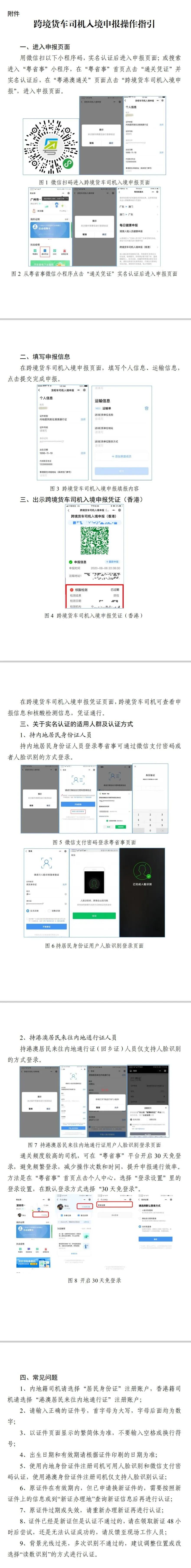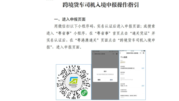 一、跨境司機(jī)入境前應(yīng)在“粵省事”微信小程序(粵省事—粵康碼—粵港澳通關(guān)—跨境貨車司機(jī)入境申報(bào))中準(zhǔn)確申報(bào)運(yùn)輸作業(yè)任務(wù)相關(guān)信息,包括作業(yè)目的地詳細(xì)信息(工廠/倉(cāng)庫(kù)名稱及所在街道)、內(nèi)地手機(jī)號(hào)碼及相關(guān)個(gè)人信息,相關(guān)操作指引詳見(jiàn)附件。入境后所申報(bào)手機(jī)號(hào)碼將會(huì)接收提醒短信。未安裝GPS定位系統(tǒng)和ETC電子不停車收費(fèi)系統(tǒng)的入境貨車,需按照相關(guān)部門安排前往指定場(chǎng)地免費(fèi)安裝GPS和ETC系統(tǒng)。