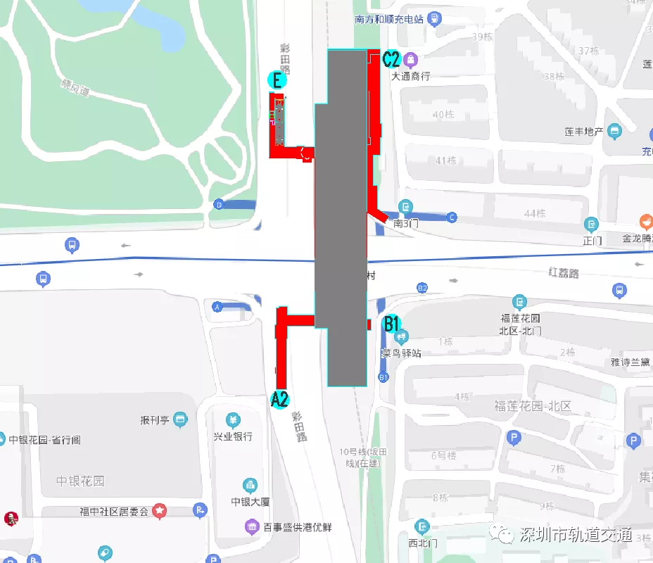 其中,B1口為既有3號(hào)線B1口;C2口接蓮花二村小區(qū)及既有3號(hào)線C口(彩田路東側(cè));E口蓮花山腳(彩田路西側(cè))、A2口接中銀大廈北側(cè)及既有3號(hào)線A口(紅荔路南側(cè))。