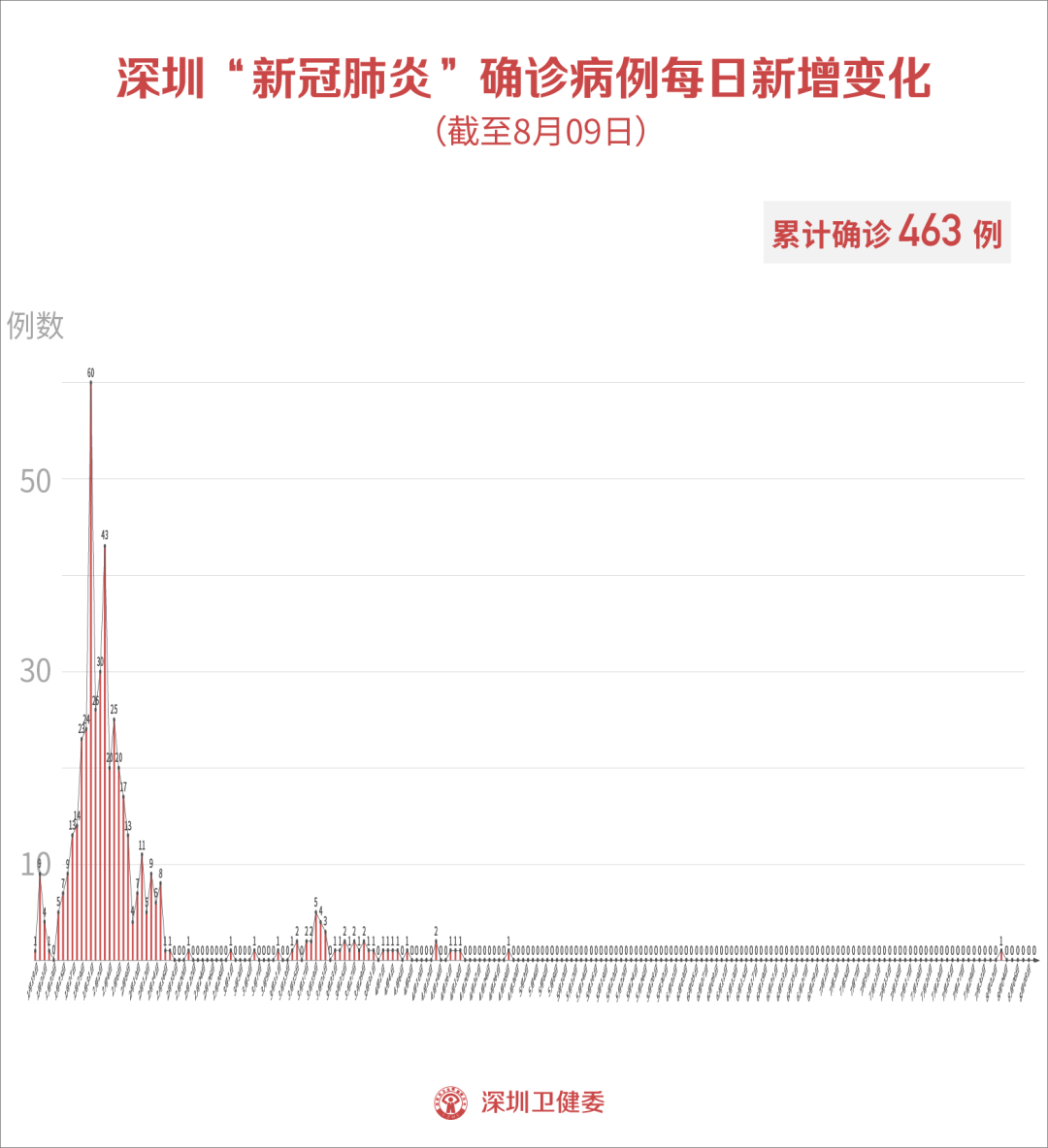 截至8月9日24時,深圳市累計報告新冠肺炎確診病例463例。目前在院1例。