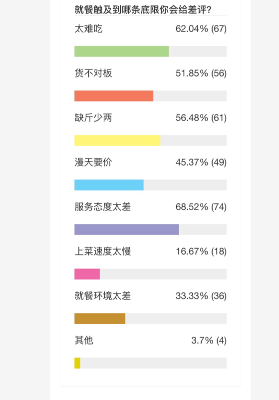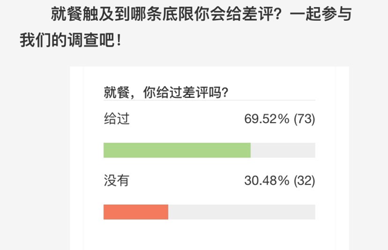 用餐后做出評(píng)價(jià),是消費(fèi)者的基本權(quán)利。針對(duì)“就餐差評(píng)”的問(wèn)題,深圳新聞網(wǎng)昨天發(fā)起了網(wǎng)友投票。結(jié)果,有69.52%的網(wǎng)友表示,他們?cè)?jīng)在用餐后給過(guò)差評(píng)。在給出差評(píng)的原因中,“服務(wù)態(tài)度差”、“太難吃”高居前兩名。對(duì)商家提出中肯的批評(píng)與監(jiān)督,是每個(gè)消費(fèi)者享有的基本權(quán)利,中肯的評(píng)價(jià)不僅是商家進(jìn)步的動(dòng)力,也讓更多網(wǎng)友能夠快速篩選定位商家,從而促進(jìn)行業(yè)的良性發(fā)展。