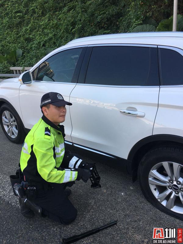 事情發(fā)生在10月11日早上10時(shí)30分許,劉先生駕車出外辦事,車輛行駛至東環(huán)高架西往東方向時(shí),突然一聲巨響左后輪輪胎爆裂車輛半路拋錨,當(dāng)時(shí)正值交通早高峰,過往車輛不斷,故障車輛停在道路中間導(dǎo)致路段交通擁堵,車主劉先生一時(shí)間不知所措,只能留在原地等待救援。此時(shí)正在執(zhí)行巡邏任務(wù)的羅湖交警鐵騎組長陳展廷見狀,立即停下警車上前查看情況,了解情況后,為了緩解該路段的交通擁堵,防止出現(xiàn)交通意外,陳展廷立即讓劉先生把車??吭谧钣覀?cè)車道,然后安排隊(duì)員用警車在故障車輛周邊設(shè)置出了安全警戒區(qū)域,另一位隊(duì)員則對(duì)過往車輛進(jìn)行指揮疏導(dǎo)及勸慰駕駛?cè)瞬灰?,在安全區(qū)域等待,陳展廷則俯下身為爆胎車輛更換輪胎。約15分鐘的忙碌后,三位鐵騎隊(duì)員已滿身是汗,但在他們的密切協(xié)調(diào)配合下,快速幫助駕駛?cè)藙⑾壬鷶[脫困境,險(xiǎn)情在最短時(shí)間內(nèi)被及時(shí)排除,道路交通秩序也恢復(fù)正常,這暖心一幕讓劉先生很是感動(dòng),緊緊握著陳展廷同志的手連聲表示感謝。