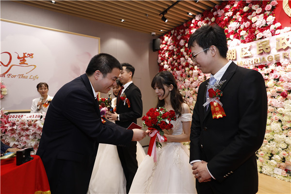 見(jiàn)圳客戶(hù)端·深圳新聞網(wǎng)12月12日訊(記者 李慧 通訊員 黎少忠 黃穎怡)“1212,要愛(ài)要愛(ài)!我們結(jié)婚啦!”,“雙十二”對(duì)大部分人來(lái)說(shuō)是一個(gè)購(gòu)物的好日子,但對(duì)打算步入婚姻的新人們來(lái)說(shuō),卻是一個(gè)不可錯(cuò)過(guò)的登記好時(shí)機(jī)。12月12日,羅湖區(qū)婚姻登記處四處洋溢著歡樂(lè)的笑聲,12對(duì)新人在滿(mǎn)是玫瑰花的婚姻登記處中舉行集體結(jié)婚儀式。據(jù)悉,這也是疫情以來(lái)羅湖區(qū)首場(chǎng)結(jié)婚登記集體頒證儀式。