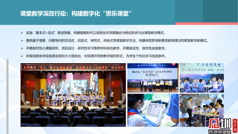 羅湖區(qū)推出的數(shù)字化“思樂課堂”相關(guān)課題,2020年被《中國教師報》認(rèn)定為中國教育課堂改革十大樣本?!八紭氛n堂”充分發(fā)揮數(shù)字技術(shù),提升課堂的邏輯性、趣味性、交互性、有效性,從而有效激發(fā)學(xué)生的學(xué)習(xí)潛能,使得深度學(xué)習(xí)在課堂中真實(shí)發(fā)生。目前,這種模式影響力也在不斷擴(kuò)大,走向全國。4月8日,深圳市錦田小學(xué)、布心小學(xué)與來自陜西、江西的學(xué)校締結(jié)了數(shù)字化“思樂課堂”姊妹學(xué)校。近期,第二批數(shù)字化“思樂課堂”的學(xué)校和教師加入這個課改項(xiàng)目。