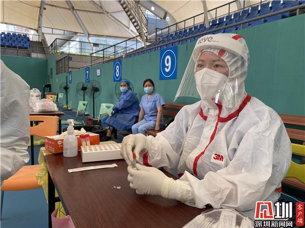 為提高轄區(qū)核酸檢測(cè)效率,羅湖區(qū)在羅湖區(qū)體育館搭建了臨時(shí)檢測(cè)點(diǎn),主要為轄區(qū)農(nóng)貿(mào)市場(chǎng)、商超、KTV等重點(diǎn)行業(yè)從業(yè)人群進(jìn)行核酸檢測(cè)。5月30日上午,記者來(lái)到羅湖區(qū)體育館網(wǎng)球館,只見(jiàn)一排的采樣作業(yè)臺(tái)有序排開(kāi),一米之外,是秩序井然的排隊(duì)人員。一張小小的采樣臺(tái),搭配兩名醫(yī)護(hù)人員,他們身穿防護(hù)服、頭戴防護(hù)罩,一名取集樣本、一名放置樣本,一個(gè)采樣流程下來(lái)不到兩分鐘,現(xiàn)場(chǎng)井然有序。烈日下,他們的汗水沿著防護(hù)罩流下來(lái),厚重的防護(hù)服下,支撐他們的是堅(jiān)守一線(xiàn)的責(zé)任感和使命感。