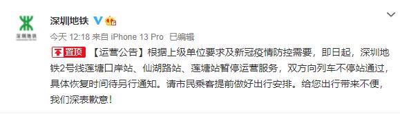 根據上級單位要求及新冠疫情防控需要,即日起,深圳地鐵2號線蓮塘口岸站、仙湖路站、蓮塘站暫停運營服務,雙方向列車不停站通過,具體恢復時間待另行通知。請市民乘客提前做好出行安排。