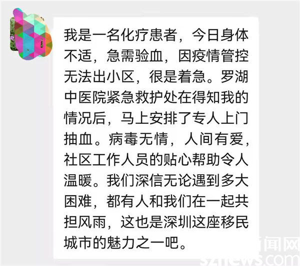 葉先生在護士為他抽血離開之后,送上了真摯地感謝?!盁o論我們遇到多大的苦難總會有人和我們一起共擔(dān)風(fēng)雨,這就是深圳的魅力”,葉先生說到。