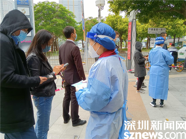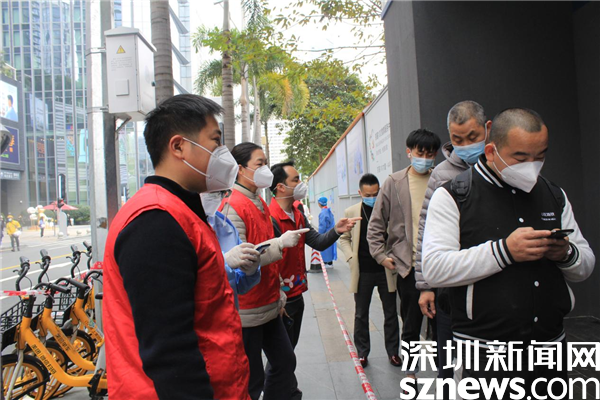 1月14日,深圳市京基智農(nóng)時(shí)代股份有限公司總部黨支部黨委副書記張玲帶領(lǐng)5位黨員,火速來到禧程酒店臨時(shí)檢測點(diǎn),經(jīng)過簡短的培訓(xùn),他們集體上崗,各就其位。有的維持秩序,有的在外圍協(xié)助查驗(yàn)綠碼,有的協(xié)助出示粵酸碼。黃子亮和彭乾偉穿上防護(hù)服,現(xiàn)學(xué)現(xiàn)做,使用自己的手機(jī)為前來采用的市民掃描粵酸碼。他們都是青壯年,雖然這是關(guān)鍵崗位,但他們一學(xué)就會,很快上手。十人一管,掃碼上傳,有條不紊,忙而不亂。