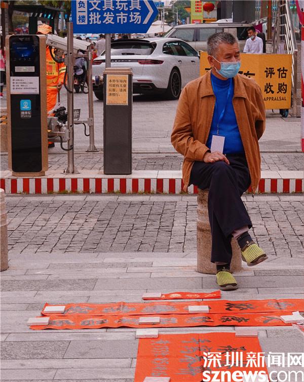 年貨市集的入口前,大爺支起了書法攤,邊上是還在地上等晾干的春聯(lián),這是年前才能看到的景象。