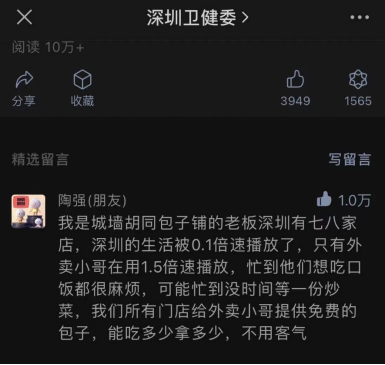 記者注意到,陶先生讓外賣小哥免費(fèi)吃包子,最早引發(fā)關(guān)注,是源自疫情特殊時(shí)期他在深圳衛(wèi)健委下的一條留言:“外賣小哥在用1.5倍速播放,忙到他們想吃口飯都很麻煩,可能忙到?jīng)]時(shí)間等一份炒菜,我們所有門店給外賣小哥提供免費(fèi)的包子,能吃多少拿多少,不用客氣?!?/p>