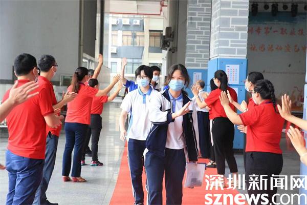 除了家長(zhǎng)的花式祝福外,老師們的加油行動(dòng)也是一道亮眼風(fēng)景線。羅湖翠園中學(xué)校長(zhǎng),高三年級(jí)主任身穿紅色送考服為考生加油。深圳市第一職業(yè)技術(shù)學(xué)校校領(lǐng)導(dǎo)和老師們?cè)诳忌亟?jīng)考場(chǎng)的路上,站成兩列縱隊(duì)等待著考生,當(dāng)考生經(jīng)過時(shí),老師們伸出手與考生擊掌,為考生加油。