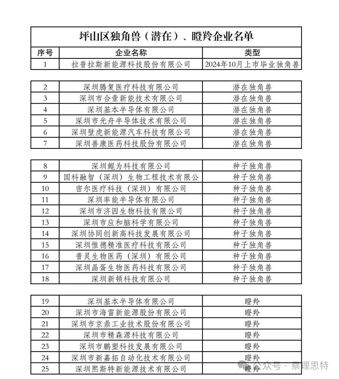 以坪山區(qū)為例,坪山區(qū)企業(yè)拉普拉斯入選全市新晉獨角獸企業(yè),也是其中3家上市畢業(yè)獨角獸企業(yè)之一。此外,坪山區(qū)有6家企業(yè)入選潛在獨角獸企業(yè),11家企業(yè)入選種子獨角獸企業(yè),7家企業(yè)入選瞪羚企業(yè)。盡管坪山只有一家企業(yè)入選全市新晉獨角獸企業(yè),但是從數(shù)據(jù)來看,坪山區(qū)潛在獨角獸企業(yè)、種子獨角獸企業(yè)和瞪羚企業(yè)很多,后勁和潛力之大可以期待。