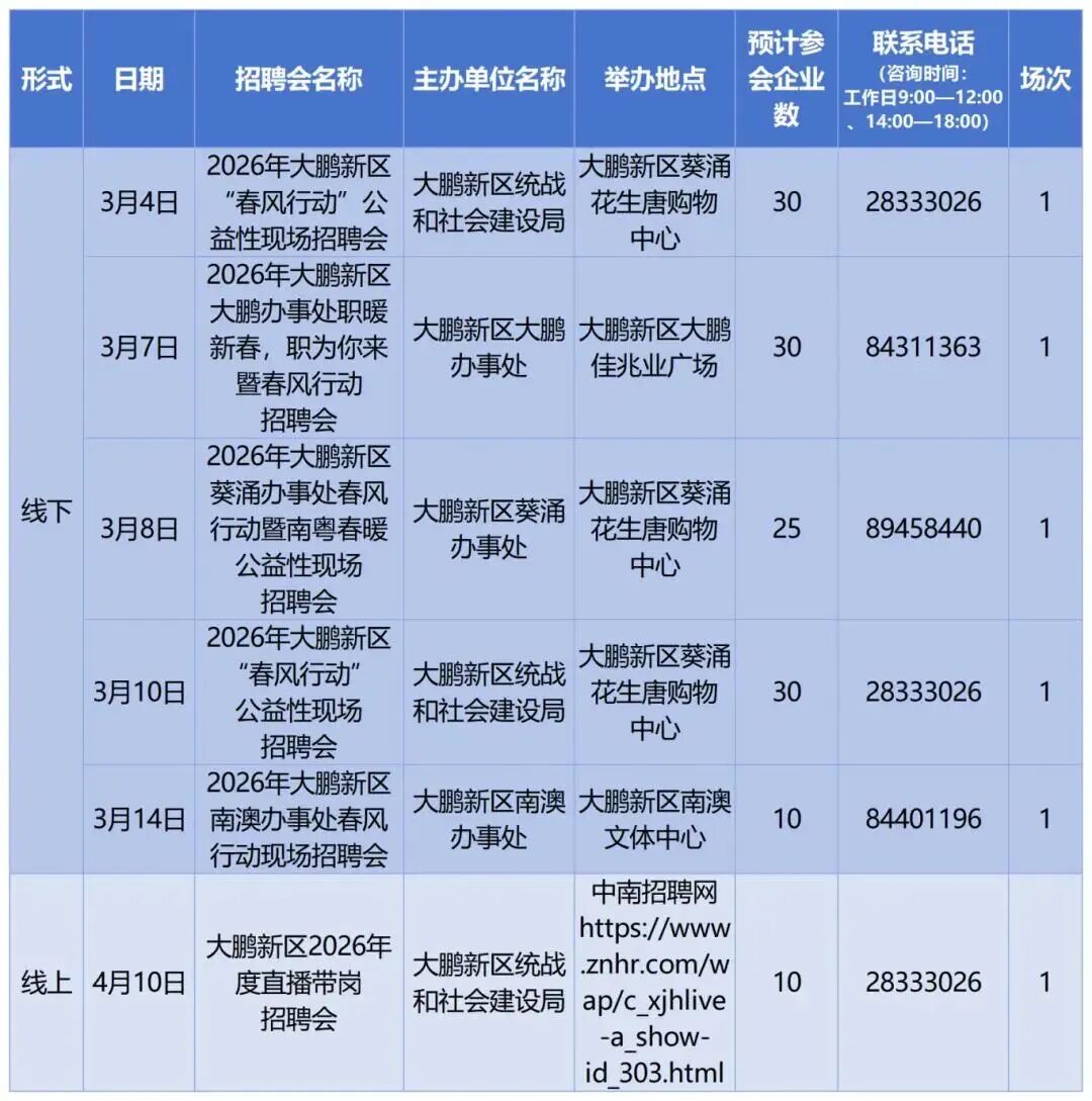 ● 大鵬:大鵬新區(qū)將舉辦6場招聘會(huì)。