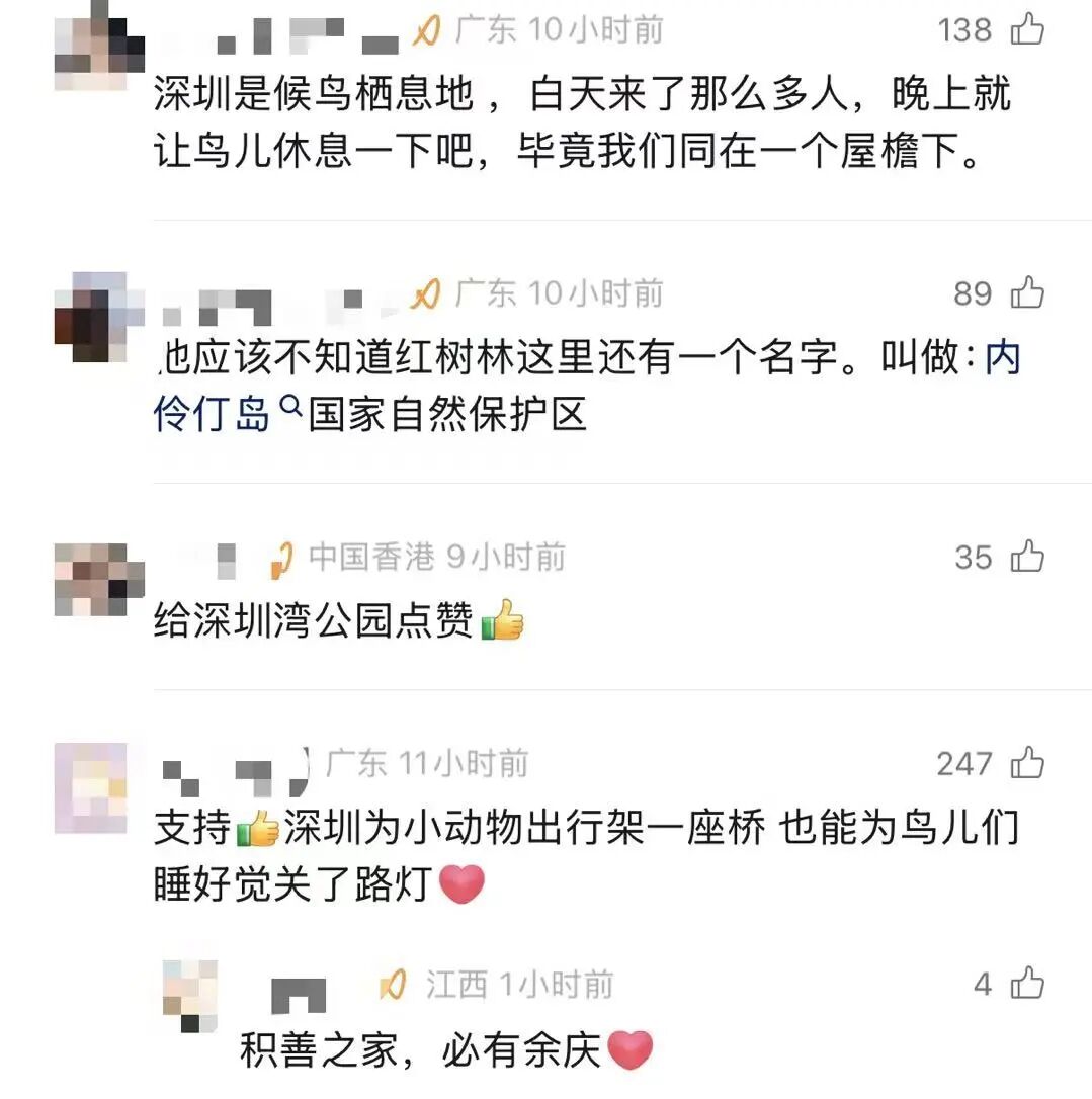 這種充分考慮到生態(tài)平衡的做法獲得網(wǎng)友好評(píng):“支持,深圳為小動(dòng)物出行架橋,也能為鳥兒睡覺關(guān)燈?!边€有人表示,“特別理解深圳這種有溫度的做法?!薄巴砩献岠B兒休息一下吧。畢竟我們同在一個(gè)屋檐下?!?/span>
