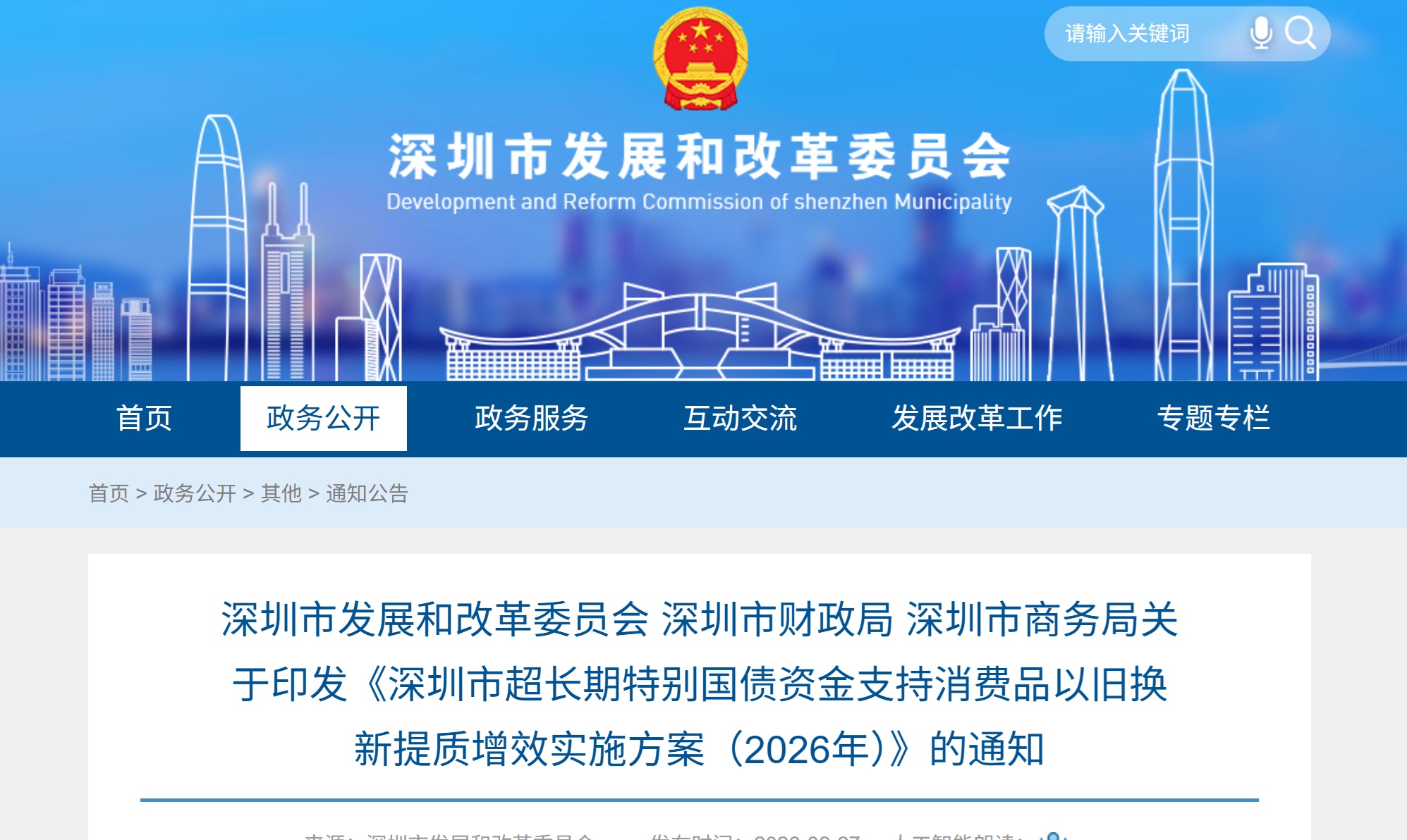 《深圳市超長期特別國債資金支持消費品以舊換新提質(zhì)增效實施方案(2026年)》(以下簡稱《方案》)經(jīng)深圳市政府同意,日前正式對外印發(fā),支持汽車報廢更新、汽車置換更新、家電以舊換新、數(shù)碼和智能產(chǎn)品購新,以及在國家政策框架內(nèi)支持其他智能產(chǎn)品購新,持續(xù)激發(fā)市場消費活力。