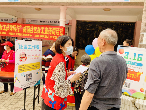 3月16日下午,深圳市清水河街道梅園社區(qū)黨委、深圳市東西方社工服務社駐梅園社區(qū)黨群服務中心的社工開展了“幸福梅園 社工伴你同行”社工宣傳周活動。