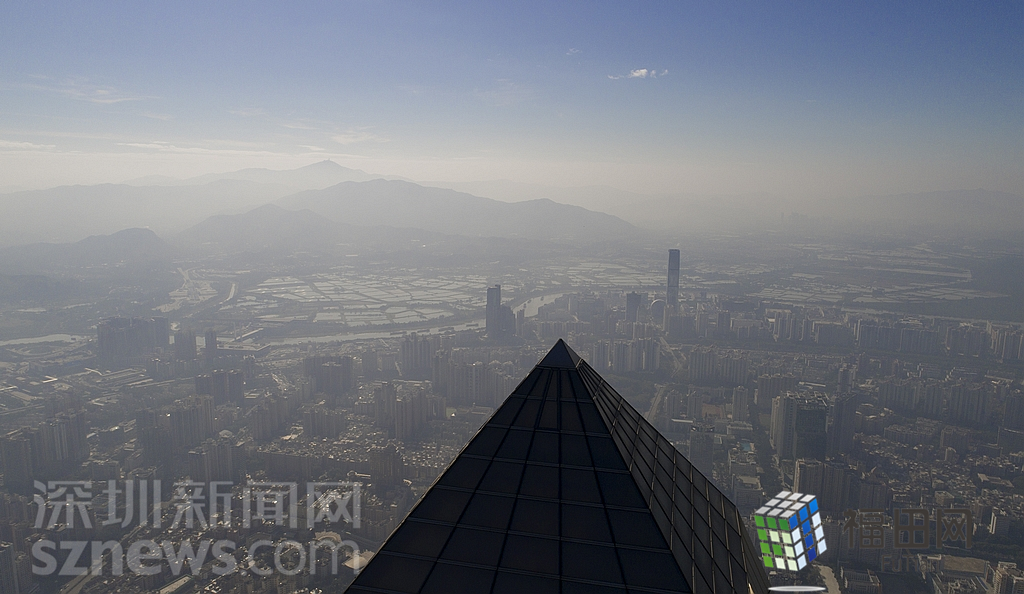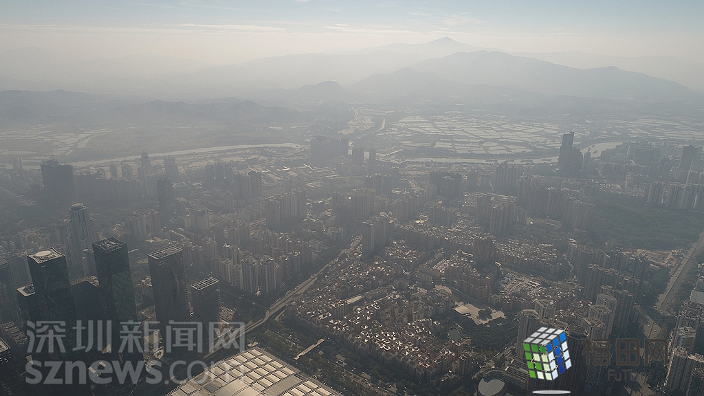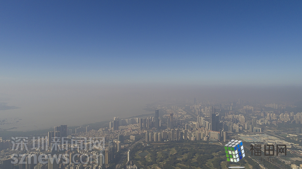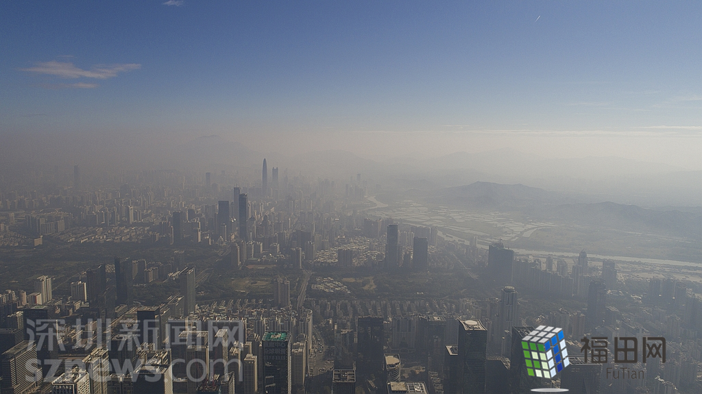 1月18日上午,記者操控無人機俯瞰深圳中心區(qū)發(fā)現(xiàn),灰霾將天空“割裂”成一道涇渭分明的界線,把城市籠罩得如同一個充滿霧靄的森林。從平安金融大廈的上空遠眺,西南面的深圳灣在灰霾的籠罩下變成了一片“沙漠”,東面的京基一百幾乎被灰霾“吞沒”,北邊平時肉眼可看的梅林山也因為能見度較低變得若隱若現(xiàn),南面的米埔濕地也被云遮霧繞。