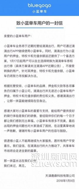 圖為小藍(lán)單車發(fā)表的聲明(資料圖片)