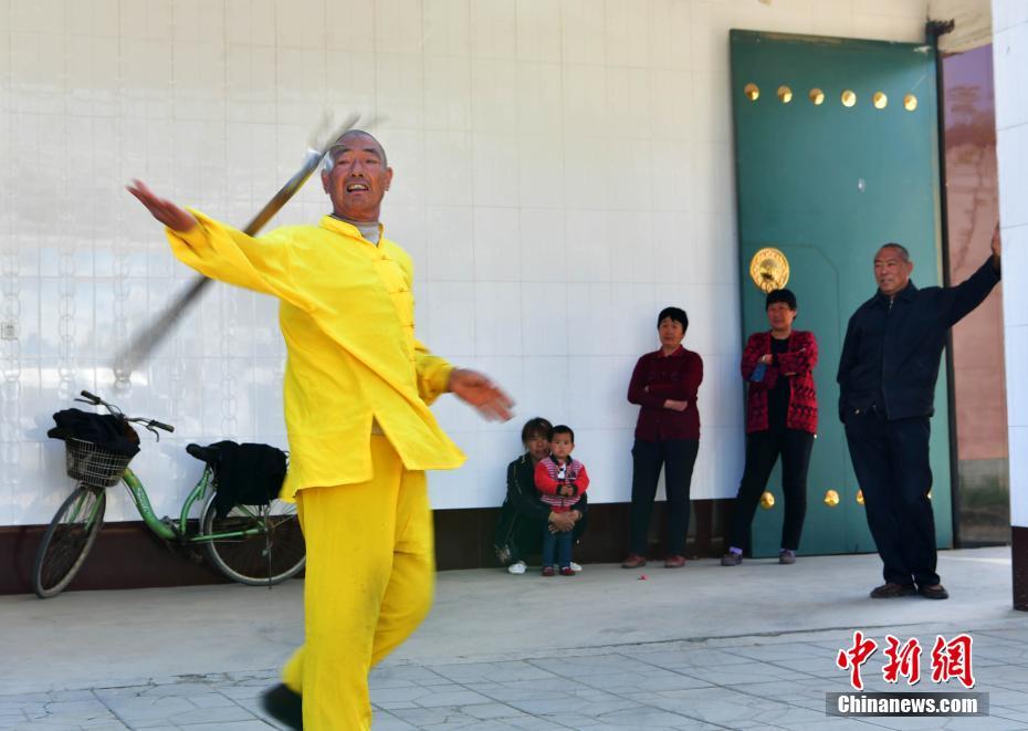 4月11日,在河北趙縣何莊,農(nóng)民蘇煥未(左一)的“滾鋼叉”技藝表演吸引了圍觀者的眼球。67歲的蘇煥未出身武術(shù)世家,自幼練就一手出神入化的滾鋼叉絕技。滾鋼叉又叫鋼叉舞、耍鋼叉,以表演驚險(xiǎn)著稱。老人的表演出神入化,鋼叉能耍出空中飛叉、滾蹚紅、金鉤釣魚、穿脖穿腰等十幾種花樣。蘇煥未表示,滾鋼叉因?yàn)榫毩?xí)非常辛苦,很少有年輕人愿意學(xué),他希望該民間技藝得到相關(guān)部門保護(hù)。中新社記者翟羽佳 攝