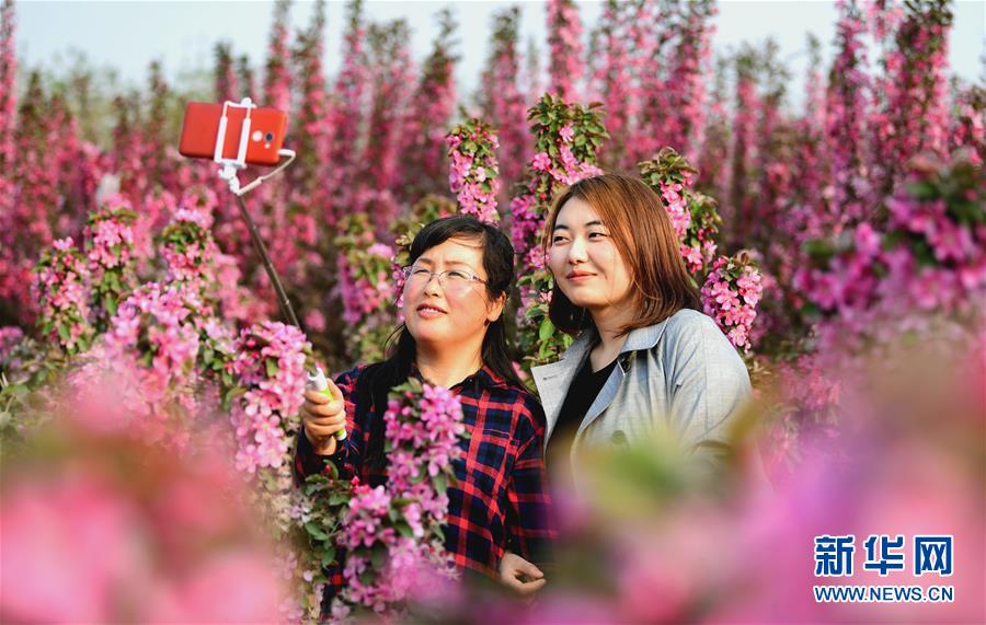 4月19日,游客在河北廊坊安次區(qū)葛漁城鎮(zhèn)千畝海棠花田自拍。