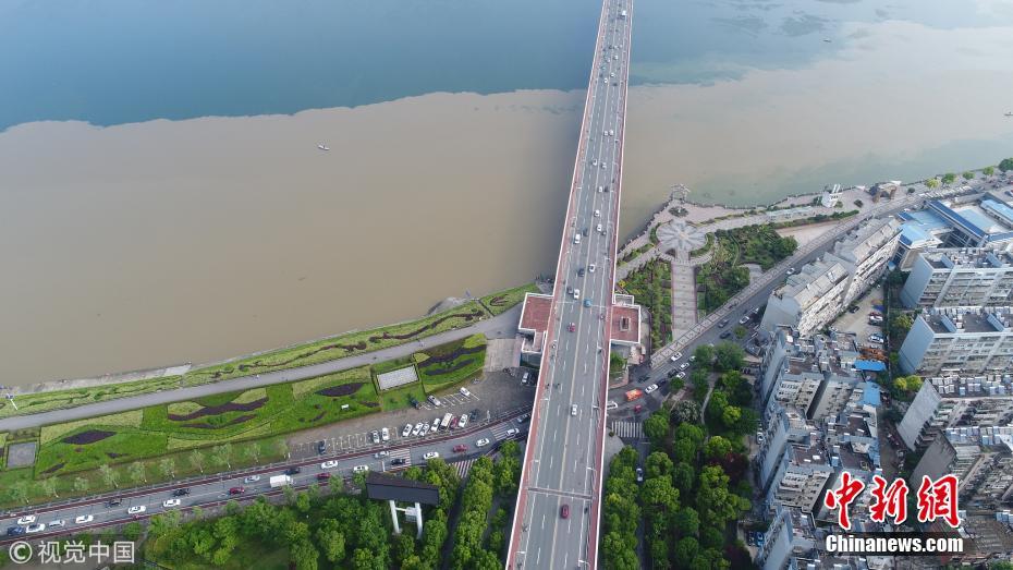 5月7日,湖北省襄陽市,無人機(jī)航拍的漢江長虹大橋處涇渭分明的漢江水面。強(qiáng)暴雨沖刷經(jīng)過去冬今春的田野地表積累的塵土,經(jīng)支流與主河道匯入時,充滿污泥的洪水與主河道上清澈的丹江水形成難得一見的涇渭分明景觀。王虎攝 圖片來源:視覺中國