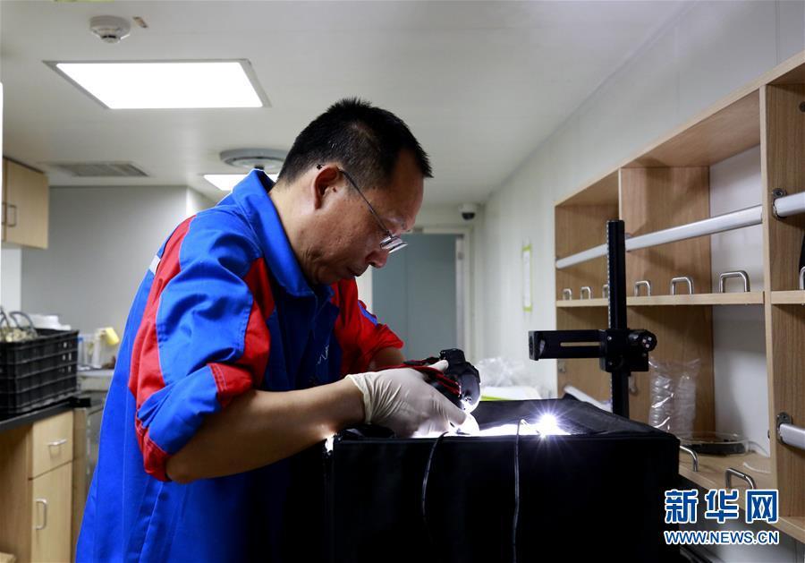 中國(guó)科學(xué)院海洋研究所李新正研究員在“探索一號(hào)”科考船上拍攝樣品(5月19日攝)。新華社記者 張建松 攝