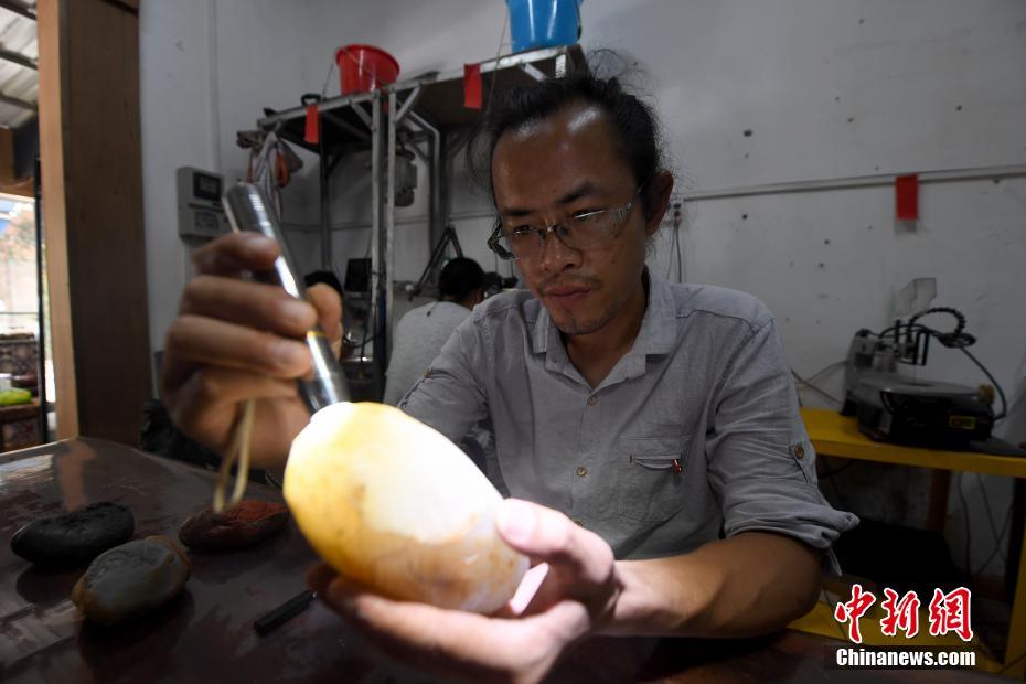 6月20日,廣西南寧市唐人文化街,錢思宇正在審料。1984年的錢思宇出生于湖南懷化,自小喜愛(ài)把玩石頭,受父輩影響,從2012年開始從事玉石雕刻工作至今。據(jù)了解,其設(shè)計(jì)的壯鄉(xiāng)玉雕作品,以人物為主,采用廣西當(dāng)?shù)靥赜械氖?,結(jié)合壯文化中的銅鼓、壯錦等元素,通過(guò)刻畫“壯鄉(xiāng)人”的神態(tài),表達(dá)廣西特有的“壯鄉(xiāng)情”。中新社記者 俞靖 攝