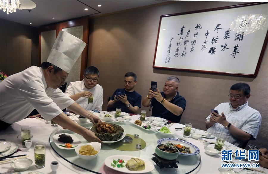 杭州酒家老板吳瑞康為客人端上自己親自制作的“叫化雞”(6月16日攝)。 金庸在武俠小說(shuō)《神雕俠侶》中借郭靖之口說(shuō)過(guò): “為國(guó)為民,俠之大者?!蔽鋫b精神在香港備受推崇,有其心向中華文化的情感基礎(chǔ)。在這個(gè)國(guó)際美食之都,品味舌尖上的武俠味,內(nèi)中的感覺(jué)別有深意。新華社記者 李鵬 攝