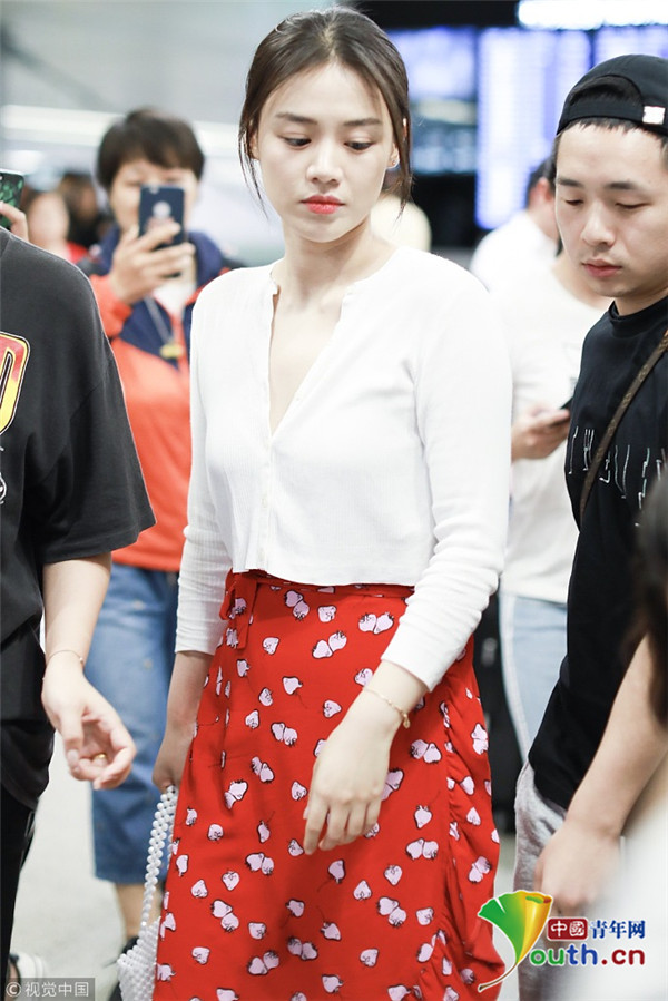 2018年7月31日,“水月”馬思純從北京飛往上?,F(xiàn)身機(jī)場,她身穿草莓圖案大紅裙,手提櫻桃小竹籃,造型清新甜美,搭配深V白襯衫,美胸若隱若現(xiàn),平添小性感。