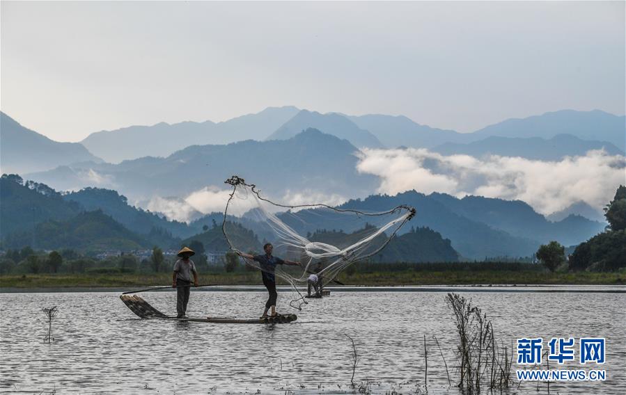 8月1日,淳安縣汾口鎮(zhèn)紅星村的漁民乘著竹排,在千島湖的支流武強溪上進行撒網(wǎng)捕撈作業(yè)。新華社記者 徐昱 攝