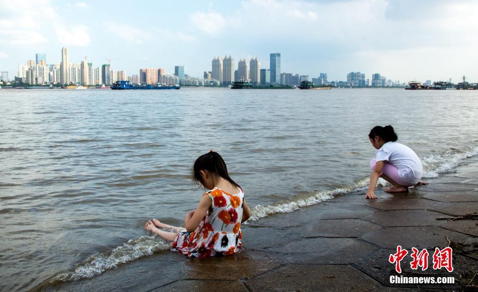 7月14日,在漢口江灘江邊,兩位小朋友岸邊戲水游玩。近日,長(zhǎng)江武漢段水位呈快速上漲趨勢(shì),江水已漫上親水平臺(tái)。中新社記者 張暢攝