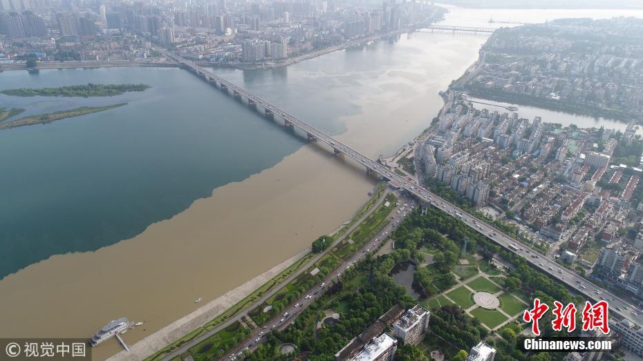 5月7日,湖北省襄陽市,無人機(jī)航拍的漢江長虹大橋處涇渭分明的漢江水面。強(qiáng)暴雨沖刷經(jīng)過去冬今春的田野地表積累的塵土,經(jīng)支流與主河道匯入時(shí),充滿污泥的洪水與主河道上清澈的丹江水形成難得一見的涇渭分明景觀。王虎攝 圖片來源:視覺中國