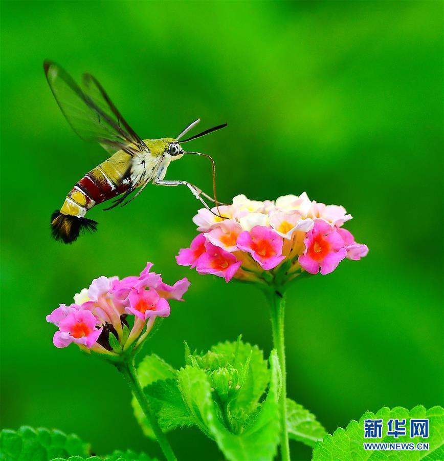 在福建省福州市溫泉公園,透翅天蛾在花間飛舞(8月18日攝)。近日,福建省福州市溫泉公園內(nèi)的馬纓丹大面積開(kāi)放?;t、草綠、蟲(chóng)飛,構(gòu)成了一幅和諧的閩都生態(tài)圖景。 新華社記者梅永存攝