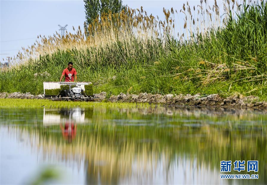 新疆察布查爾錫伯自治縣種羊場(chǎng)托海依村村民在農(nóng)田里插秧(5月21日攝)。近日,隨著氣溫漸高,地處新疆伊犁河谷的察布查爾錫伯自治縣迎來(lái)插秧高峰期,田間地頭一派繁忙景象。塊塊稻田水滿如鏡,田間防護(hù)林枝繁葉茂,遠(yuǎn)處雪山依稀可見(jiàn),如一幅在大地上鋪展開(kāi)的生態(tài)畫(huà)卷。新華社記者胡虎虎 攝