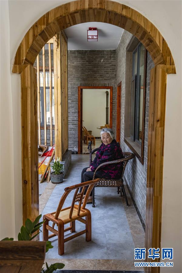 一名堰河村老人在新入住的民居的回廊休息(5月13日攝)。