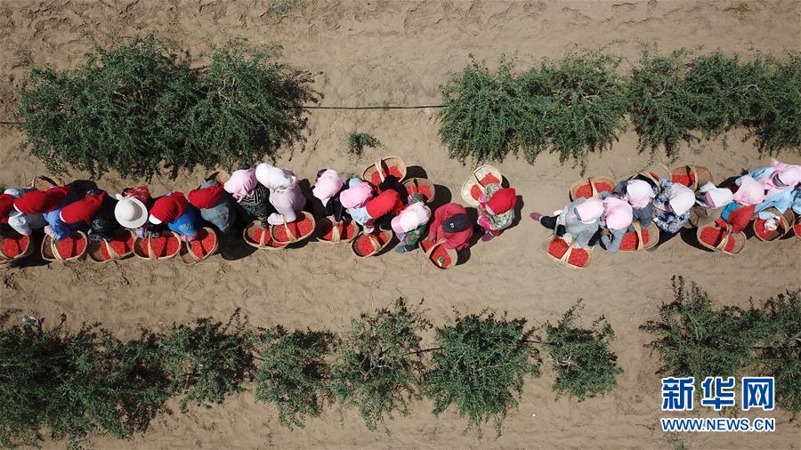 紅寺堡生態(tài)移民區(qū)的移民在百瑞源枸杞種植基地采摘頭茬枸杞(5月30日無(wú)人機(jī)拍攝)。近日,在寧夏吳忠市紅寺堡區(qū)百瑞源枸杞種植基地,頭茬枸杞迎來(lái)采摘收獲季。今年頭茬枸杞采摘期比往年提前20天左右。據(jù)了解,該基地地處紅寺堡生態(tài)移民區(qū),占地3000畝,采摘季節(jié)每天有數(shù)百名當(dāng)?shù)匾泼裨谔镩g采摘?jiǎng)谧?。新華社記者王鵬 攝
