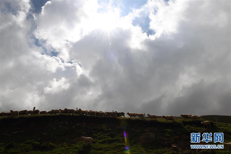 8月27日,當(dāng)?shù)剞r(nóng)民飼養(yǎng)的羊在大海草山吃草。