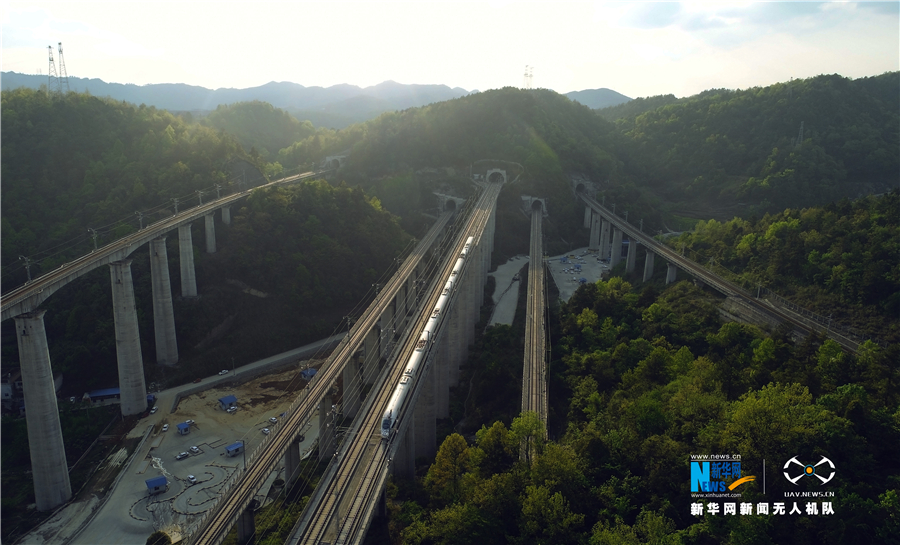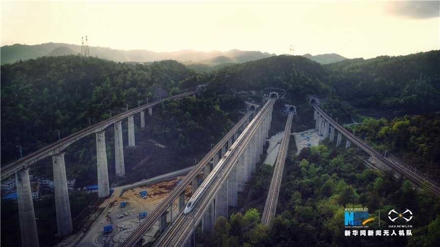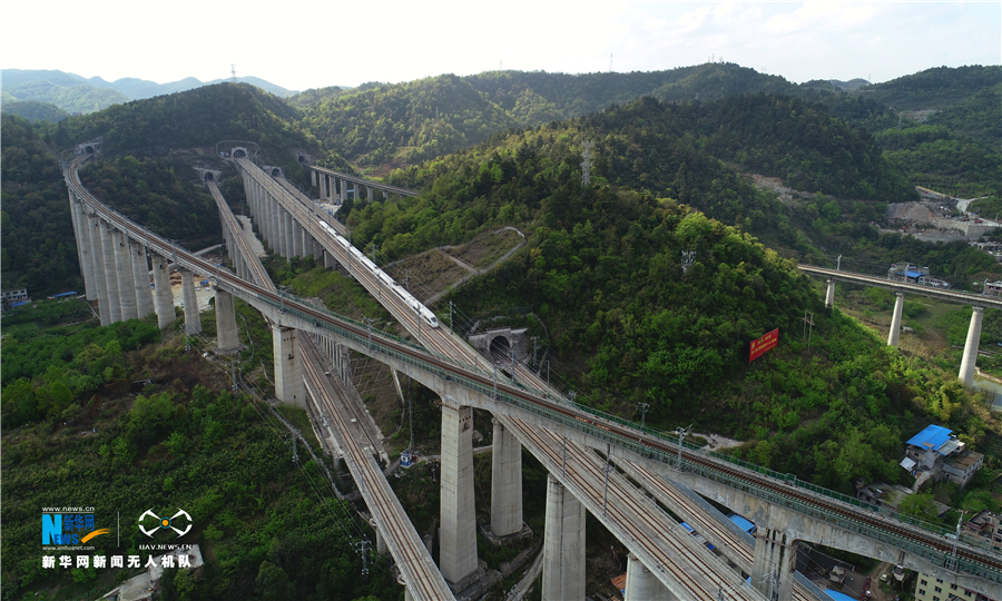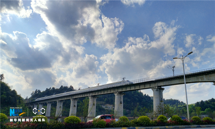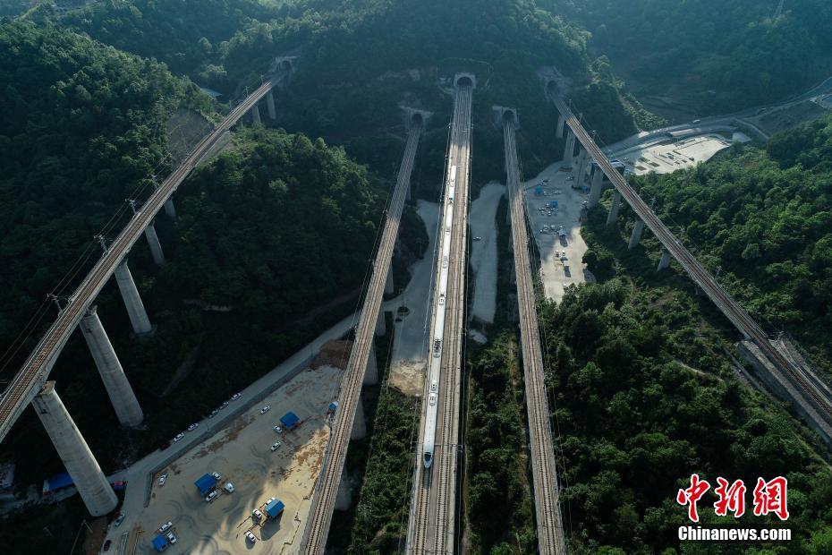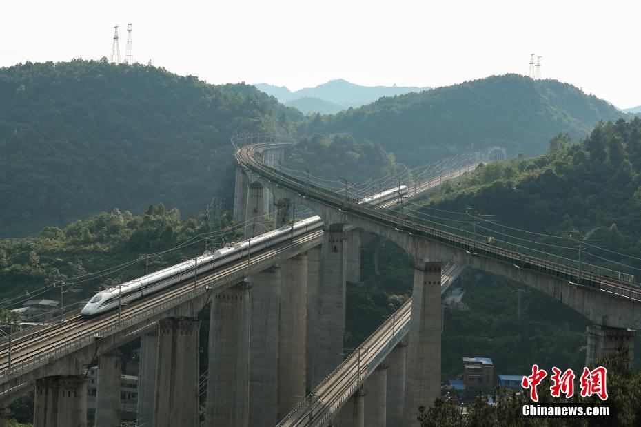 5月16日,航拍貴陽市郊交織的五條高鐵線路,一列動車駛出隧道。貴州省地處中國西南腹地,高原山地居多,因此高鐵建設的橋隧占比較高。在貴陽市烏當區(qū)新添寨,高鐵滬昆線、貴廣客運專線、貴開城際客運專線的隧道和橋梁交織在一起,形成“五洞五橋”并行。中新社記者賀俊怡 攝 5月16日,一列動車從貴陽市郊交織的橋梁上駛過。貴州省地處中國西南腹地,高原山地居多,因此高鐵建設的橋隧占比較高。在貴陽市烏當區(qū)新添寨,高鐵滬昆線、貴廣客運專線、貴開城際客運專線的隧道和橋梁交織在一起,形成“五洞五橋”并行。中新社記者賀俊怡 攝