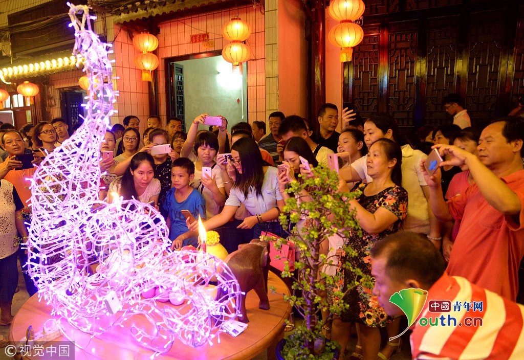 2016年9月15日晚,廣西來(lái)賓市忻城縣城關(guān)鎮(zhèn)城廂街舉行中秋節(jié)供月扎彩燈(走馬燈)民俗活動(dòng),5萬(wàn)余名區(qū)內(nèi)外游客涌入老街,體驗(yàn)獨(dú)特的文化魅力和民俗風(fēng)情,人們?cè)诶辖謨?nèi)賞月、賞花燈、品美食、拍照,流連忘返。