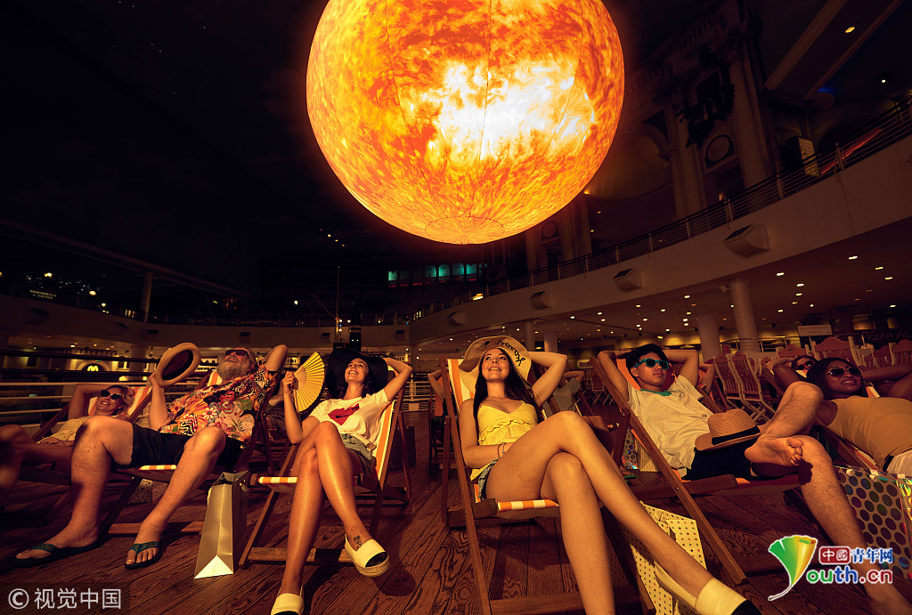 當?shù)貢r間2018年9月18日,英國曼切斯特,顧客們在特拉福德購物中心的一個巨型的“太陽”下享受室內(nèi)日光浴,感受英國未完的史上最熱夏天。這個人造“太陽”的亮度相當于1.2萬個燈泡。圖片來源:視覺中國