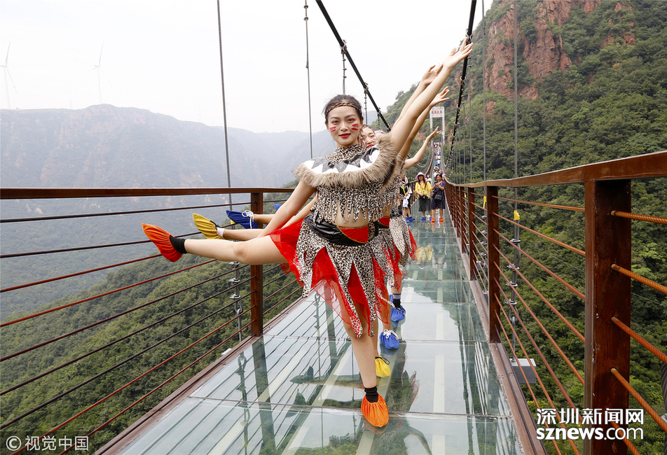 2018年6月30日,鄭州新密一景區(qū)的玻璃吊橋上,幾名美女大學(xué)生身穿“野人”服裝練習(xí)瑜伽,吸引了眾多游客的圍觀。據(jù)了解,這些大學(xué)生來(lái)自鄭州。